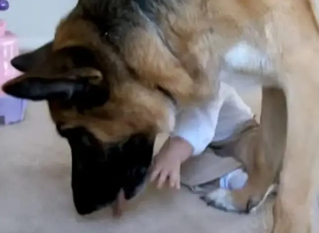 It only takes him a few seconds to realize that the toddler was the culprit. He gently licks at her hand and tries to gingerly take it away from her.
