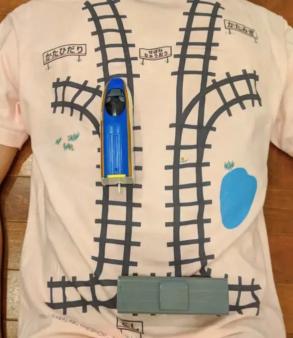 Ken would lay on the floor and allow his son to roll his trains on the tracks printed on the t-shirt. In turn, Mr. Kawamoto would get a free back massage.