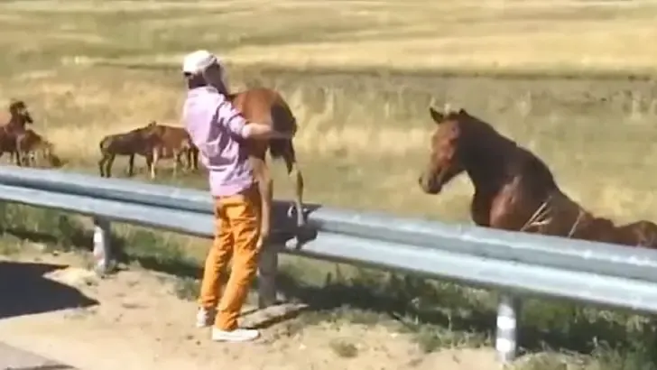 Motorist Lifts Baby Horse Over Fence To Its Mother After It Got Stuck