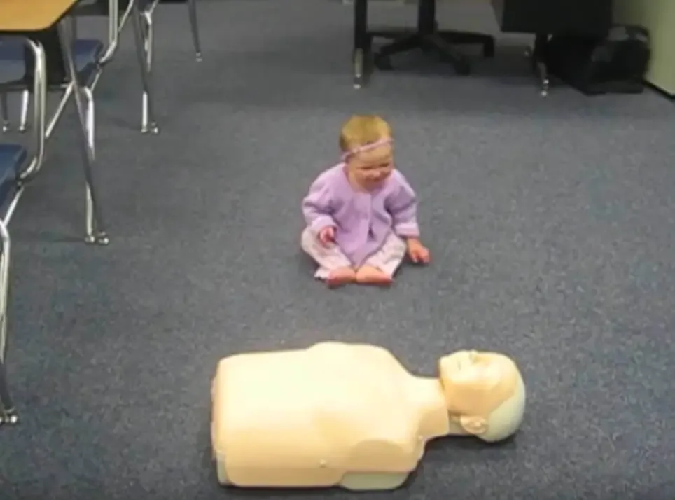 To the utter surprise of her mom, the baby crawled over to the abandoned test dummy and began applying compressions to its chest.