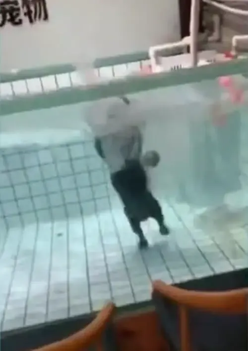 A woman in China visited a pet shop with her dog, a French bulldog. One of the shop’s features is an exercise pool.