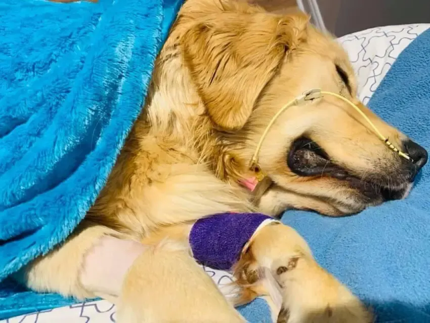 Sam, a golden retriever that was just a little over a year old, had already swallowed some of the rope.