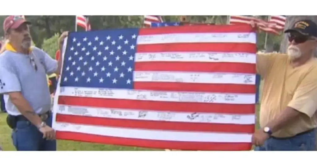 Her sons later explained to the couple that this was something called a “tribute flag” – a flag that, after being signed by everyone else in this person’s platoon, should have been given to the fallen Marine’s family.