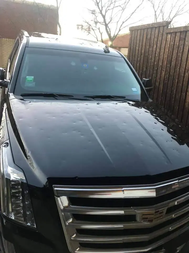 The poor Cadillac Escalade was completely peppered in dents from the heavy hail that poured from the sky.