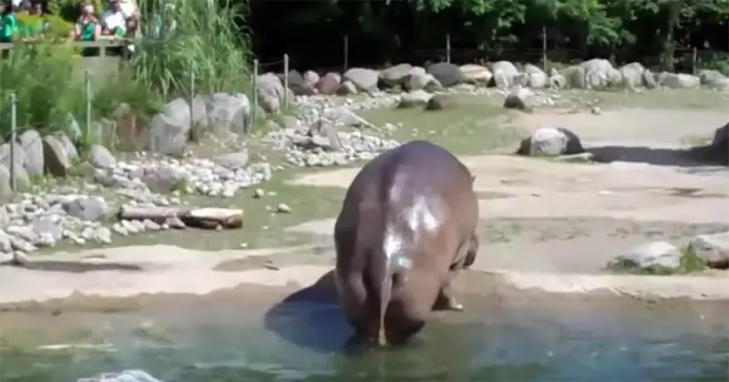 A hippopotamus by the name of Harry felt the pressure building and calmly emerged from his pool of water to give onlookers an unexpected show.