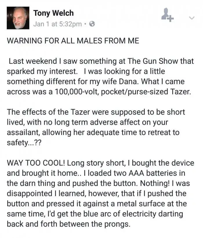 Before giving it to her, he wanted to check that it worked properly and made the mistake of tasing himself. He then wrote about the experience on facebook.