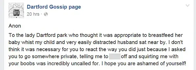 Posted anonymously as a submission to a Facebook page known as Dartford Gossip, a tale is told by a woman who believes public breastfeeding is inappropriate.