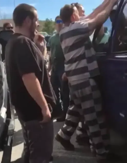 They hurried over to the car to help out, an odd scene in their striped prison uniforms boasting the typical black and white colors we associate with heartless criminals.