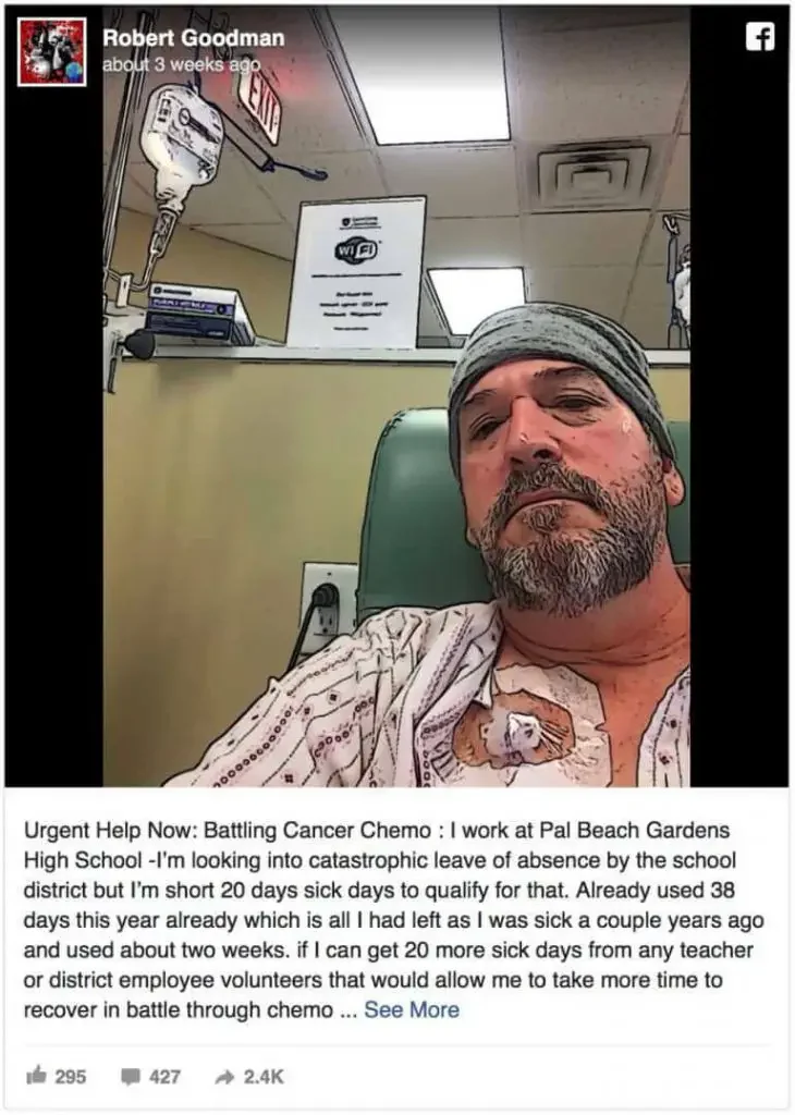 Alongside a selfie that he took in his hospital room, Robert posted the call for other teachers, asking if there were any who would be willing to transfer some of their own sick days to him.