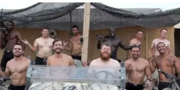 The soldiers used what they had on hand to make a version of the video, wearing combat boots and using homemade sunbeds instead of the fancy poolside scene the cheerleaders had in their video.