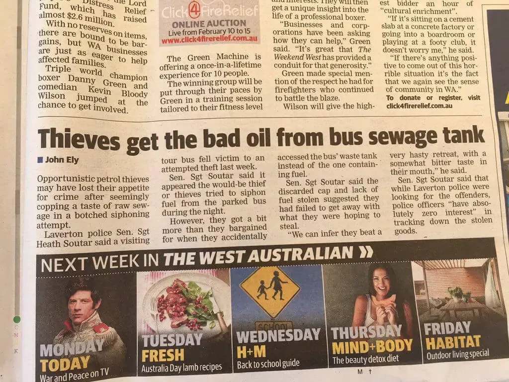 Two thieves in Australia thought they had a clever idea for obtaining gasoline without having to pay for it.