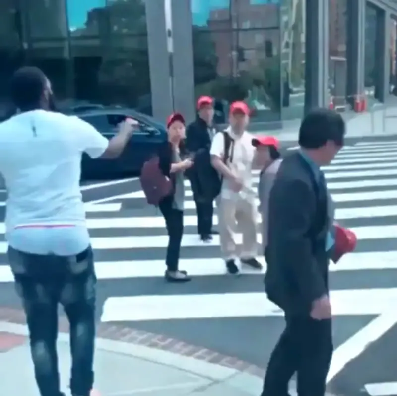 In the harrowing 15-second clip, the anti-Trump bunch is seen snatching the caps off of the family’s heads and tossing them in the air.